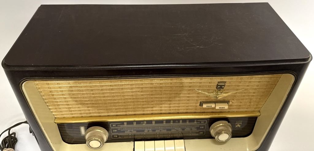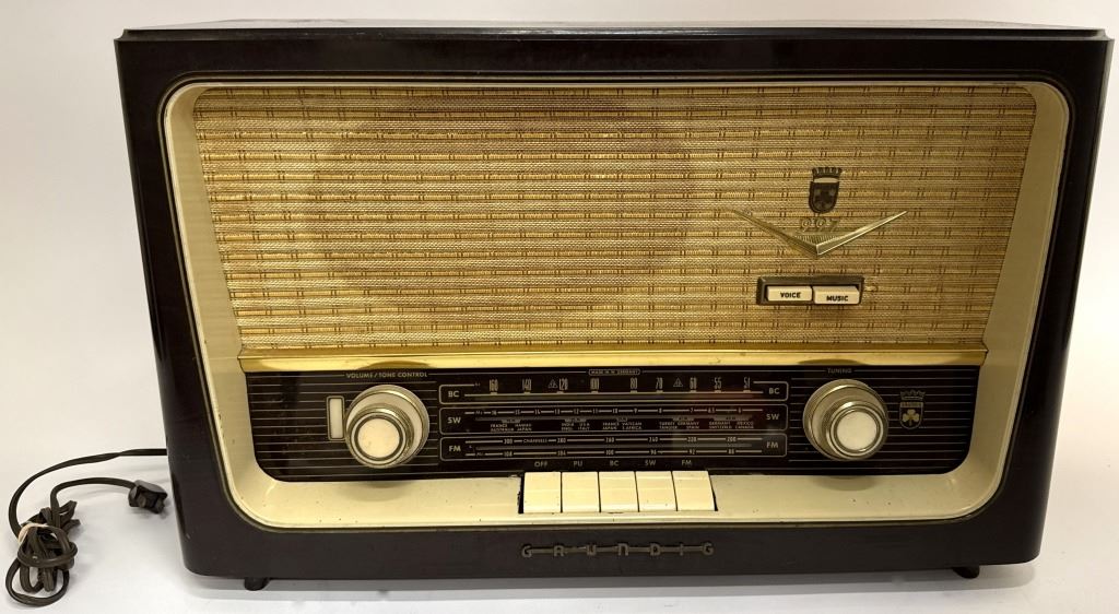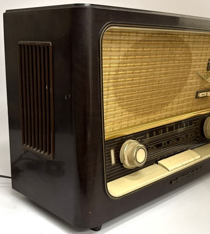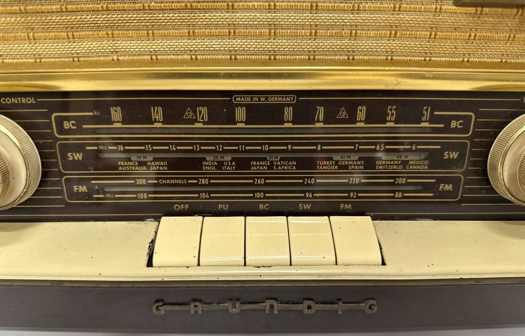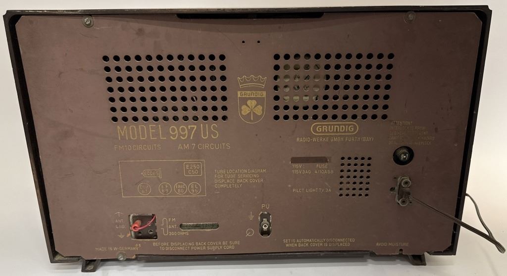 Item/Description: The Grundig Shortwave Tube Radio (Model 997) is a vintage German table radio model imported to the U.S. It was designed to receive FM, AM, and shortwave bands.