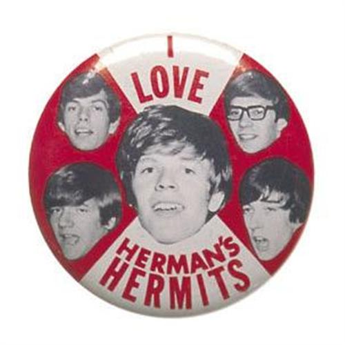HERMAN?S HERMITS PIN-BACK BUTTON, edge reads ?BUTTON WORLD MFG., inc. B?kln 36, N.Y. - Official Licensee © PREMIER TALENT ASSOCIATES, inc.?, 3 1/2 inches.