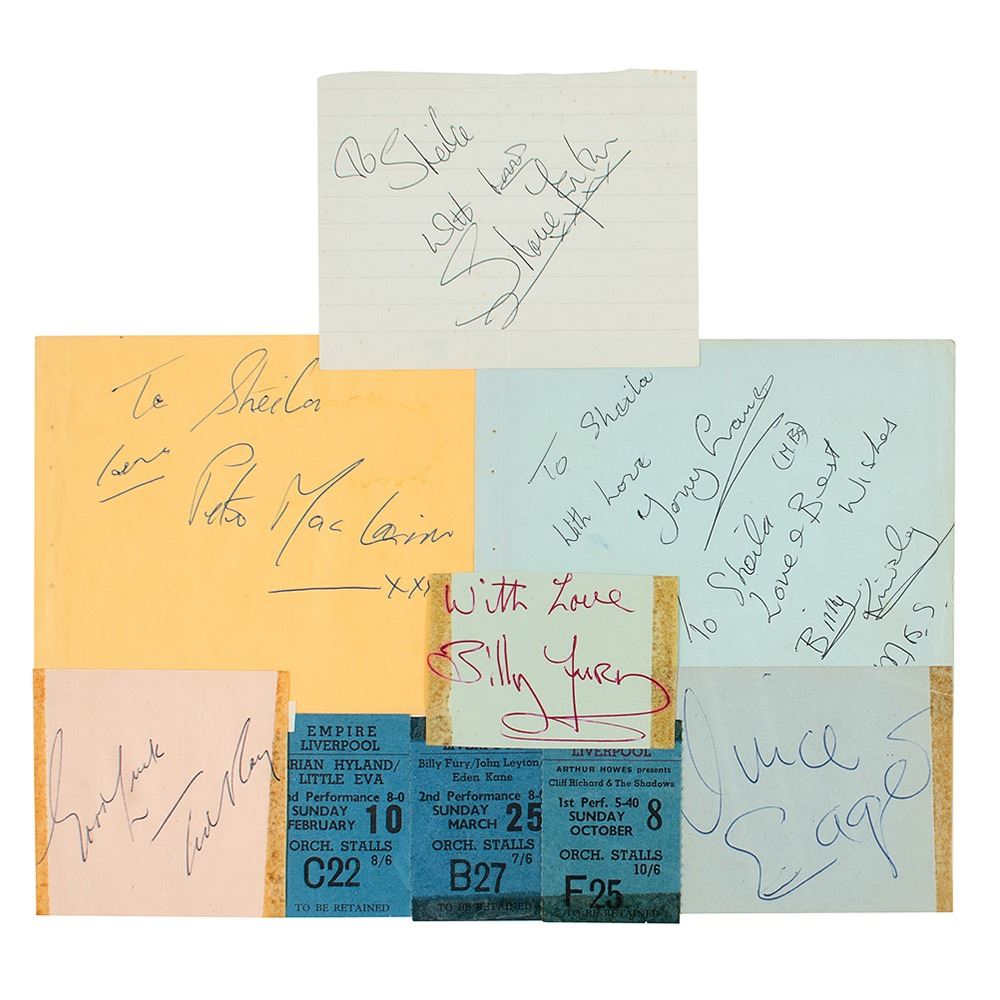 Vintage circa 1960s autograph book belonging to Sheila Forrest, 6 x 4, containing signatures of Liverpool artists including Billy Fury, Pete Maclaine, Ted Ray, Cliff Bennett, Vince Eager, Joe Brown, Shane Fenton, Billy Kinsley, and Tony Crane. Also includes three ticket stubs for performances in Liverpool by Cliff Richard, Billy Fury/John Leyton/Eden Kane, and Brian Hyland/Little Eva. In very good condition, with all pages and loose signatures detached, most of which have old tape along their edges.