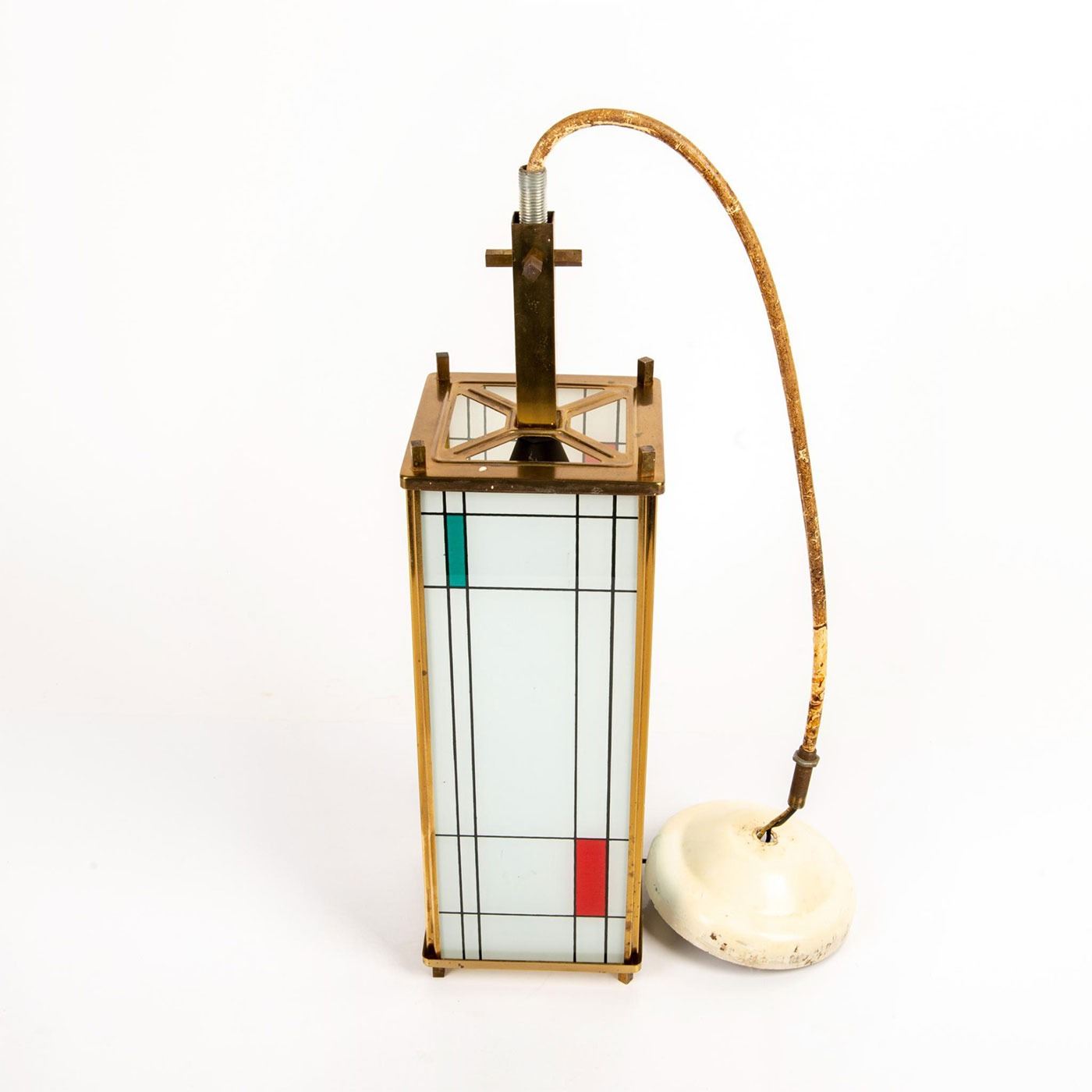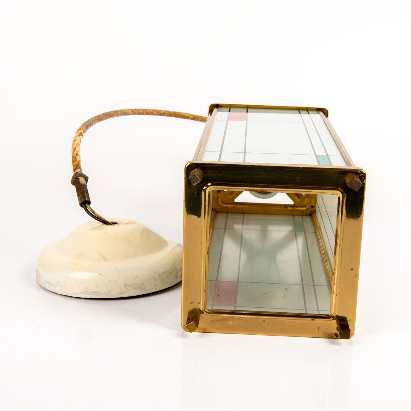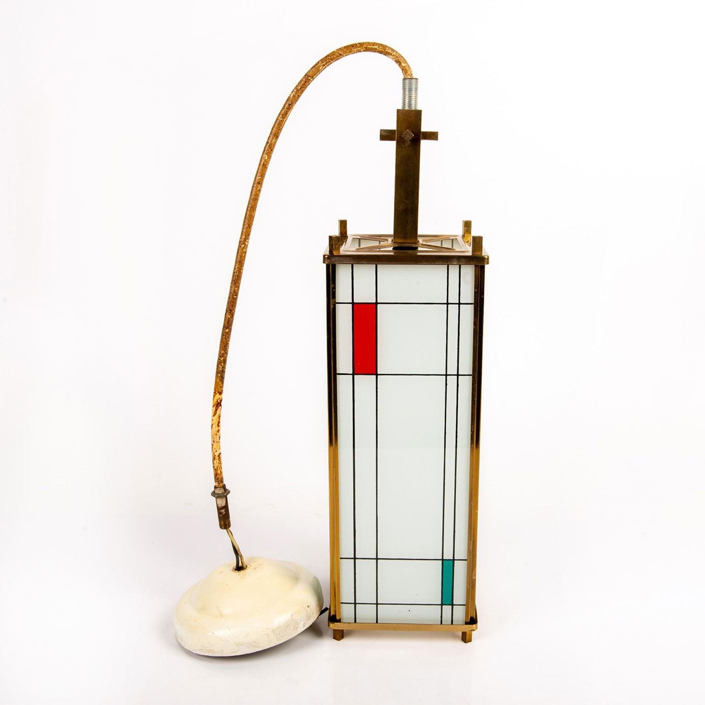 Piet Mondrian inspired, Polished brass, ceramic glass panels with fired-on designs of colored rectangular form and black lines. Piet Mondrian (Dutch 1872-1944), regarded as one of the greatest artist of the 20th century, best known for his abstract paintings made from squares and rectangles. Light bulb casing is damaged; easily replaceable.