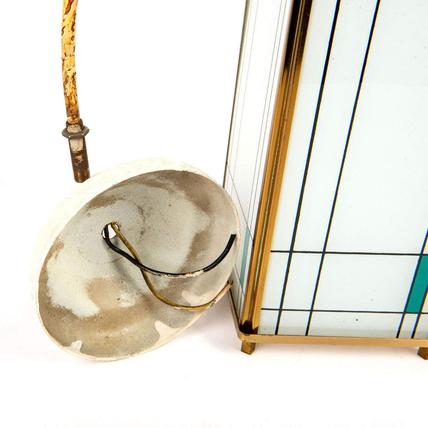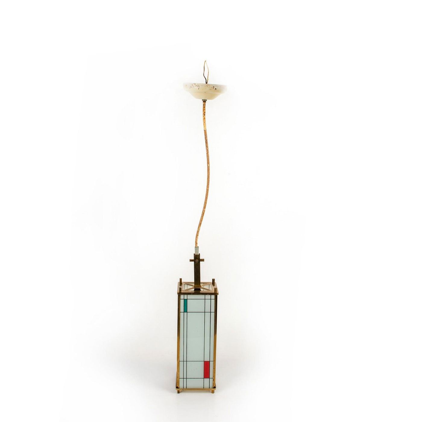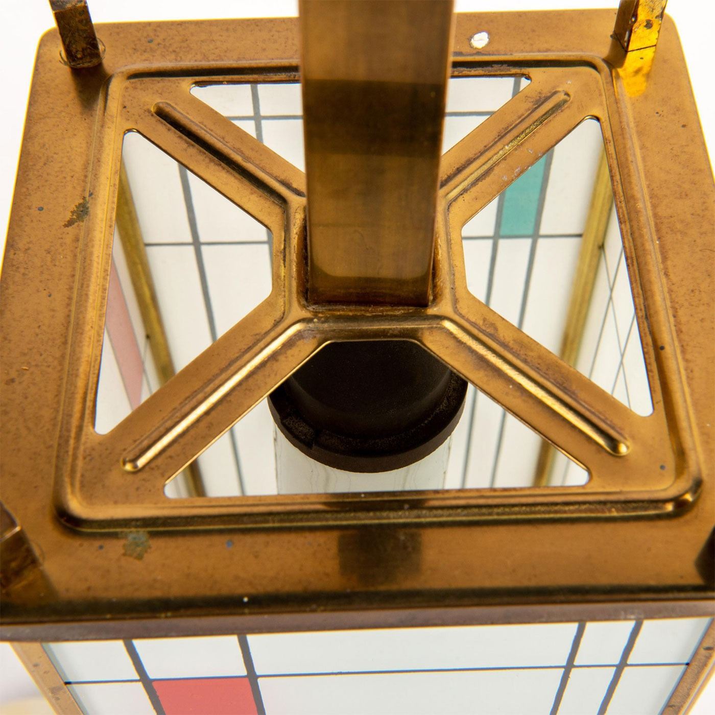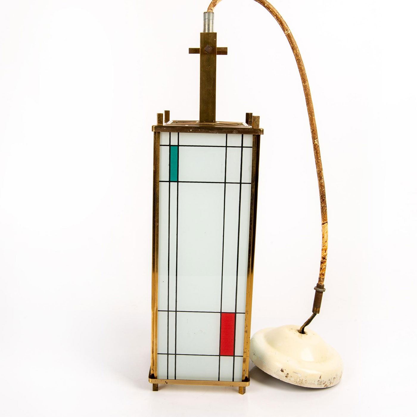 Piet Mondrian inspired, Polished brass, ceramic glass panels with fired-on designs of colored rectangular form and black lines. Piet Mondrian (Dutch 1872-1944), regarded as one of the greatest artist of the 20th century, best known for his abstract paintings made from squares and rectangles. Light bulb casing is damaged; easily replaceable.