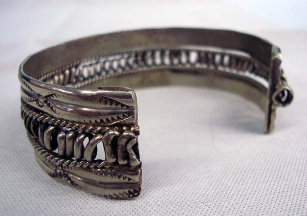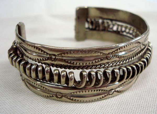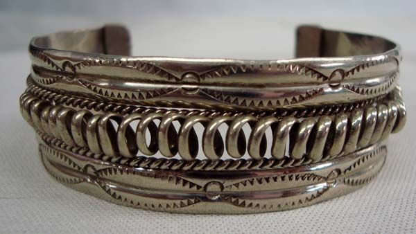 1960s Navajo Sterling Cuff Bracelet. This vintage bracelet is a floating rope design. It tested sterling, but is not marked. The bracelet is 7/8'' wide and 7.25'' inside including opening. Its weight is 33 grams.