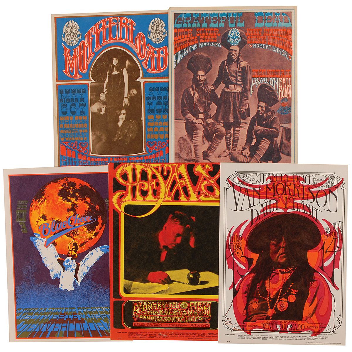 Five original Family Dog type-A handbill postcards, 1967–68, 5 x 7, for the following concerts: Grateful Dead at the Avalon Ballroom, Big Brother and the Holding Company at the Avalon Ballroom, Country Joe and the Fish at the Avalon Ballroom, Van Morrison at 1601 W. Evans in Denver, and Blue Cheer at 1601 W. Evans in Denver. In overall fine condition, with various light creases and soiling.