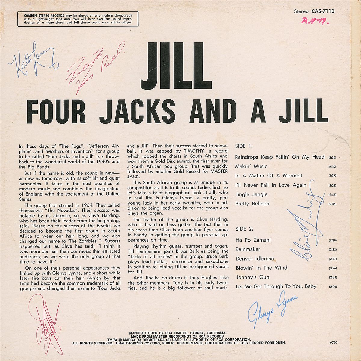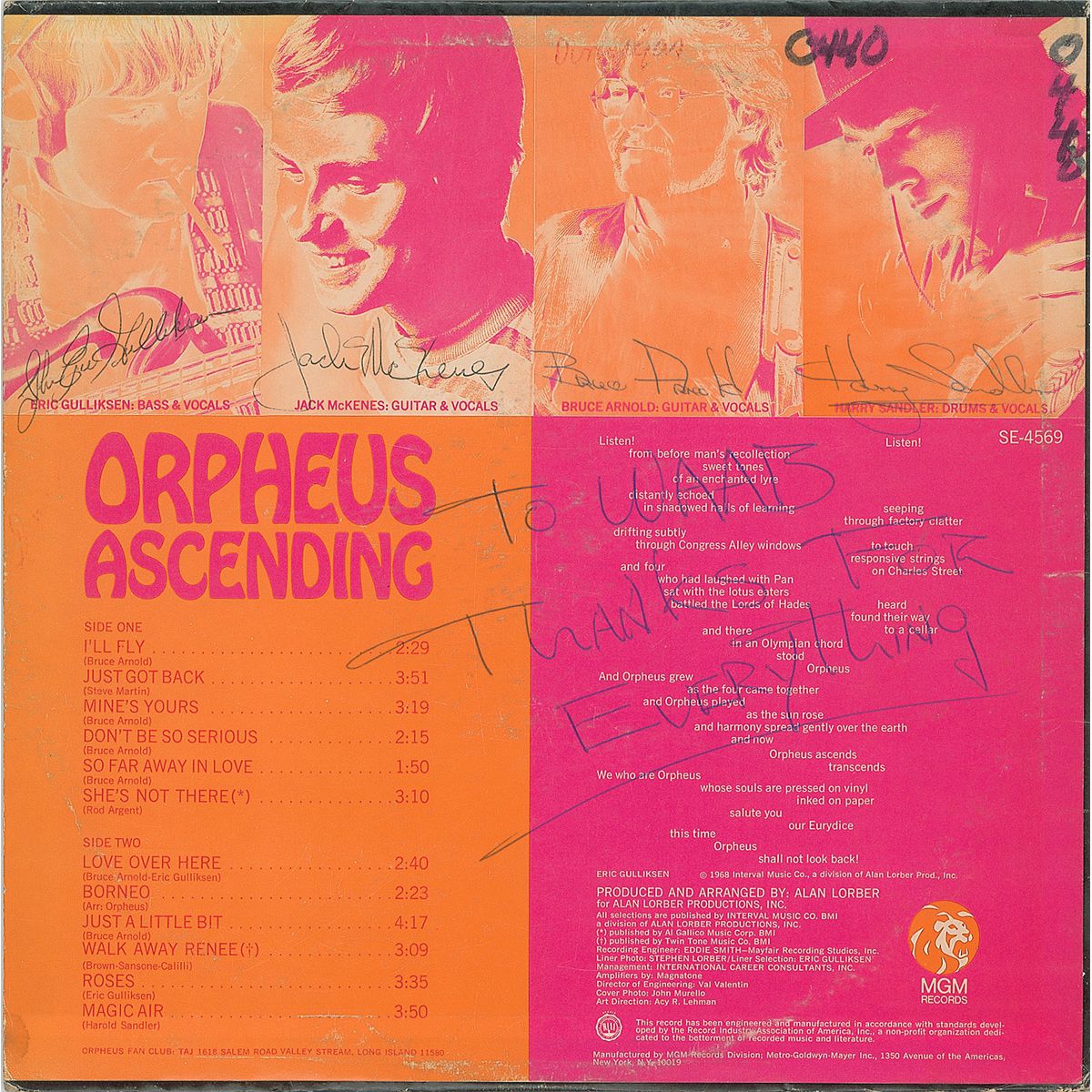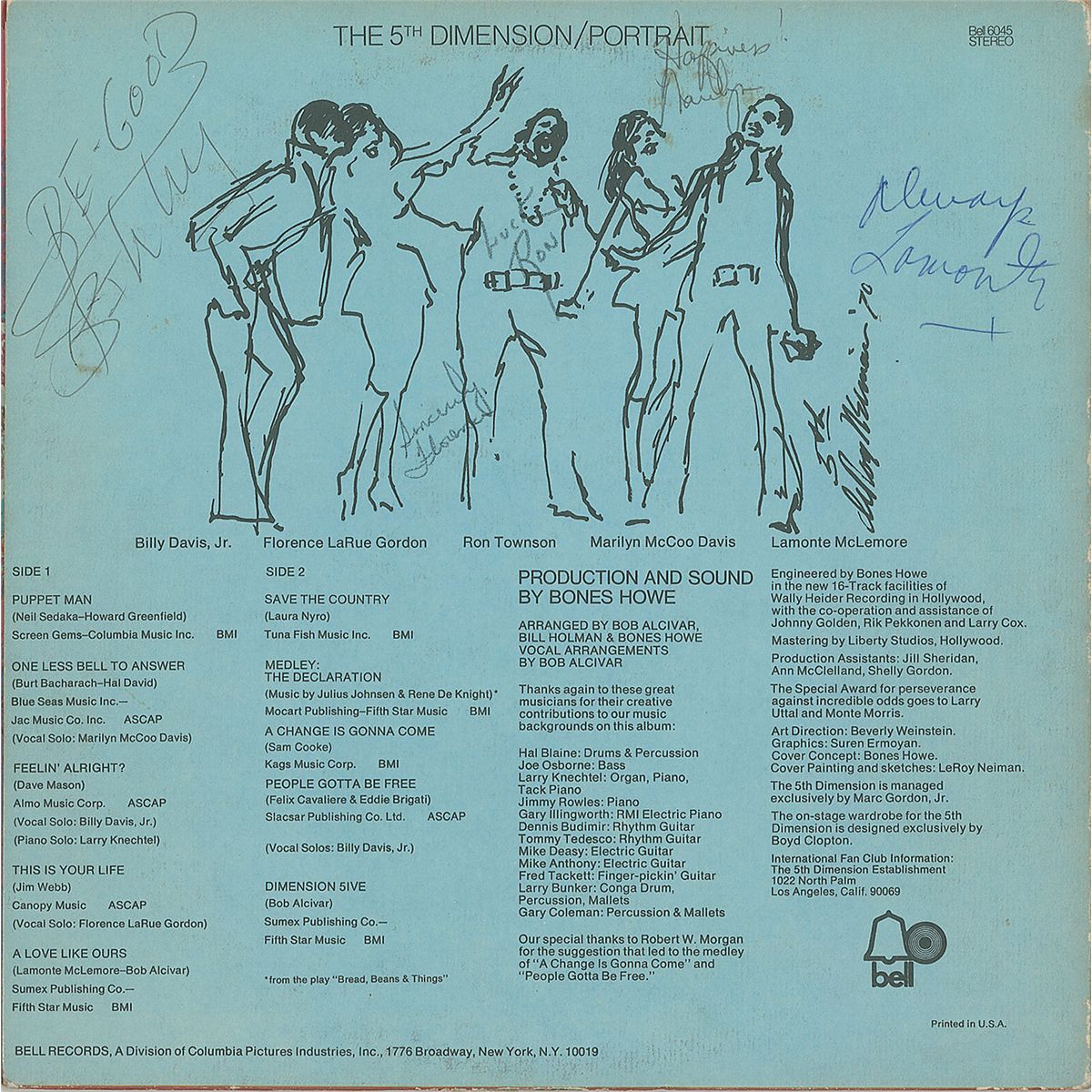 Three albums, each signed and inscribed on the back in ink by the band members, including: Four Jacks and a Jill (Glenys Lynne, Clive Harding, Tony Hughes, Pierre van Riel, and Keith Lansom); The 5th Dimension (Marilyn McCoo, Billy Davis, Jr., Florence LaRue, Ron Townson, and Lamonte McLemore); and Orpheus (John Eric Gulliksen, Jack McKennes, Bruce Arnold, and Harry Sandler). In overall very good to fine condition, with various edge chips and dings, and a few ink notations. All records are included.