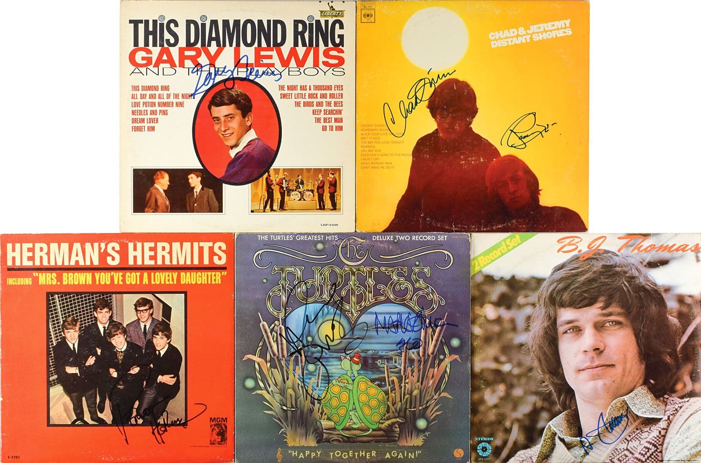 Five albums signed on the front cover in felt tip by one or more notable 1960s rock musicians, including: Chad Stuart and Jeremy Clyde (Distant Shores), Gary Lewis (This Diamond Ring), B. J. Thomas (self-titled), Howard Kaylan and Mark Volman of The Turtles (Happy Together Again!), and Peter Noone of Herman’s Hermits (Introducing Herman's Hermits). In overall very good to fine condition. The records are included. Consignor notes that all of the signatures were obtained in person.