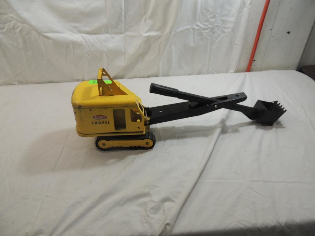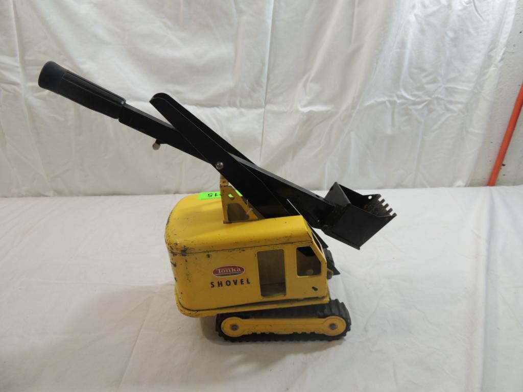 VINTAGE METAL CONSTRUCTION TOY SHOVEL TOY, CATAPILLER TRACK, PRESSED METAL TONKA TOY, CONSTRUCTION TOY, AS SHOWN SEE PHOTO FOR MORE DETAILS.