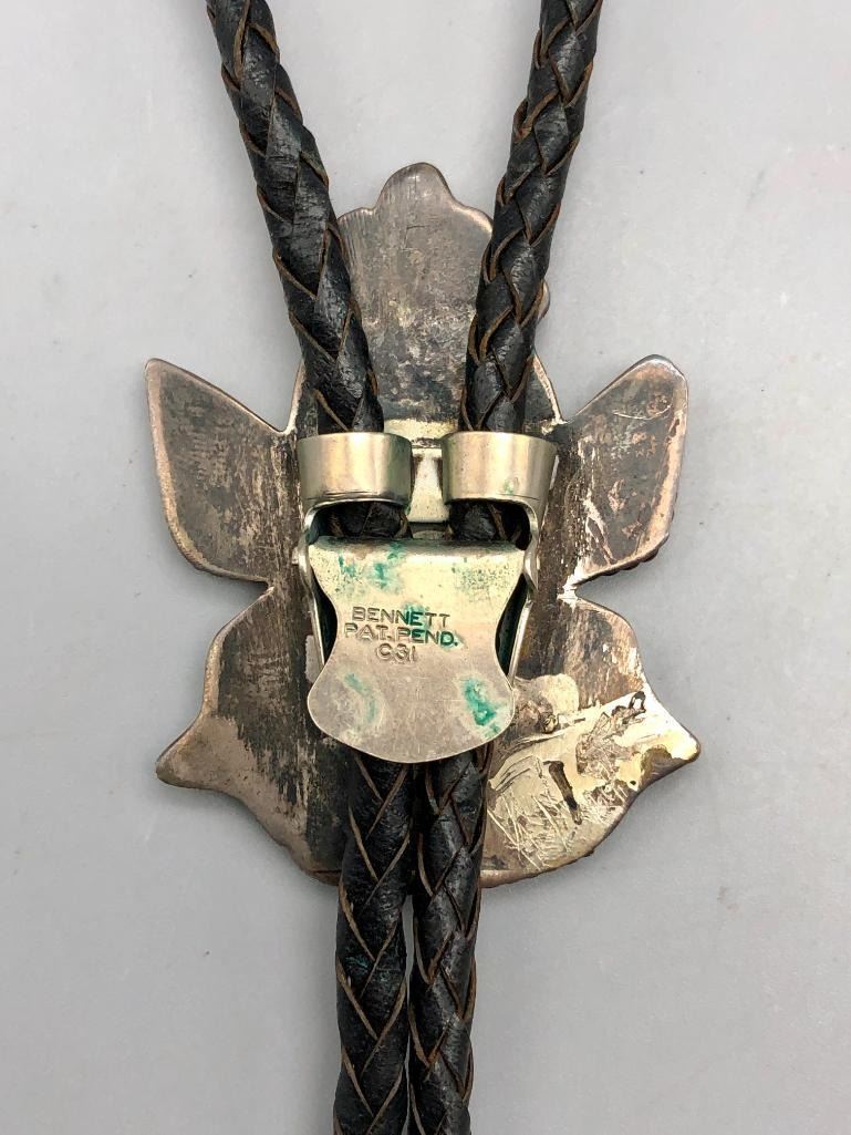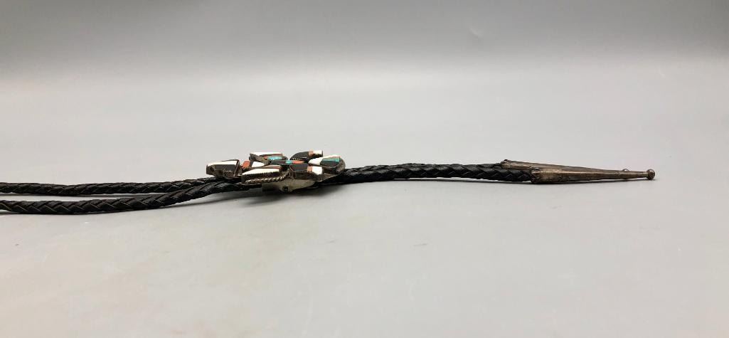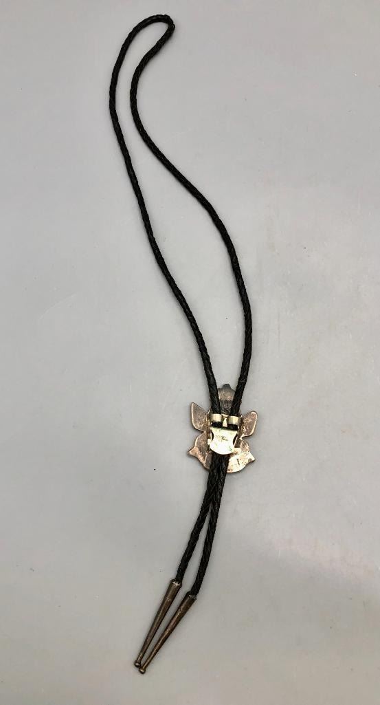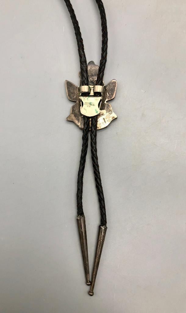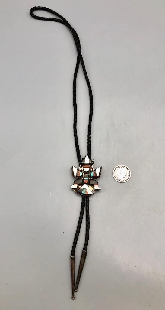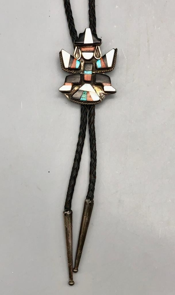 Offered for sale in this lot is a 1960s Knifewing inlay bolo tie. This is a well crafted bolo featuring a Knifewing design. It is set with turquoise, onyx, shell, mother of pearl and is accented with simple silverwork to tie the piece together. It is made from sterling silver and is on a black leather cord with nice tips. MAKER/ARTIST: Unmarked. APPROX AGE: Circa 1960s. SIZE: Braided cord measures 37 inches long including tips. Slide measures 2-1/8 inches long X 1-5/8 inches wide. Weighs 30.1 grams. CONDITION: Good for its age, normal wear expected. Please look closely at the pictures as they are an important part of our description and are hereby incorporated into the description, specifically with regards to condition. SHIPPING: There will be a $5 handling / packaging fee for shipping this lot. The actual cost of postage will be added on top of that. BUY IT NOW: If you would like to buy this item now, without waiting for the auction day to bid on it, we do offer this option (which is available up to 48 hours before the actual auction starts). The “Buy it Now†price is the high estimate of this lot (plus applicable fees and the Buyer's premium is discounted to 10% when using the Buy it Now option). If you would like to exercise this option, you must contact us by email (or phone as long as you talk to someone live). Reference this lot number and your intention to "Buy it Now."