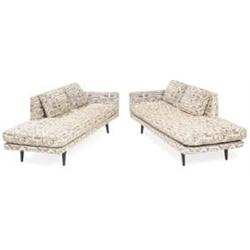 1960s daybeds, possibly by Dunbar, pair, left and right forms on ebonized wood bases with matching upholstery and two down-filled back cushions each, original finish, unmarked, 77.5”w x 29.5”d x 27”h, very good condition