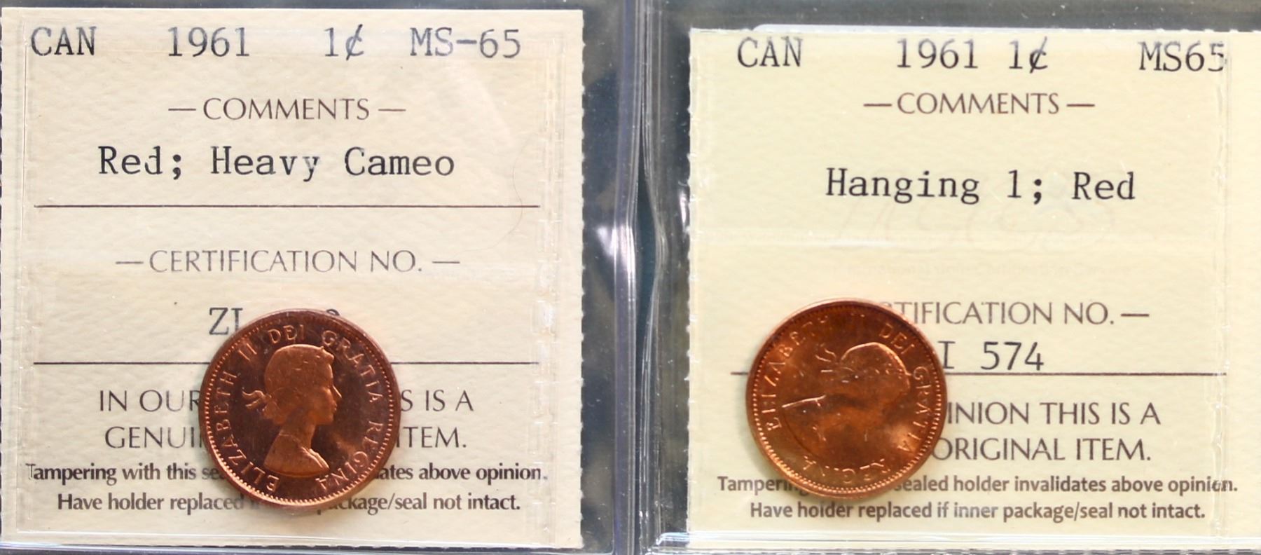1961 1¢ HC and 1961 Hanging 1, both ICCS Gem Mint State-65RED.