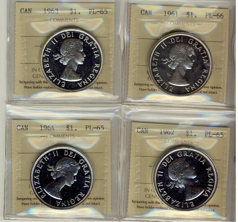 1961 $1 PL66, 1962, 1963 and 1964 $1 ICCS PL65. Lot of 4 coins. 1961 Designated Cameo.