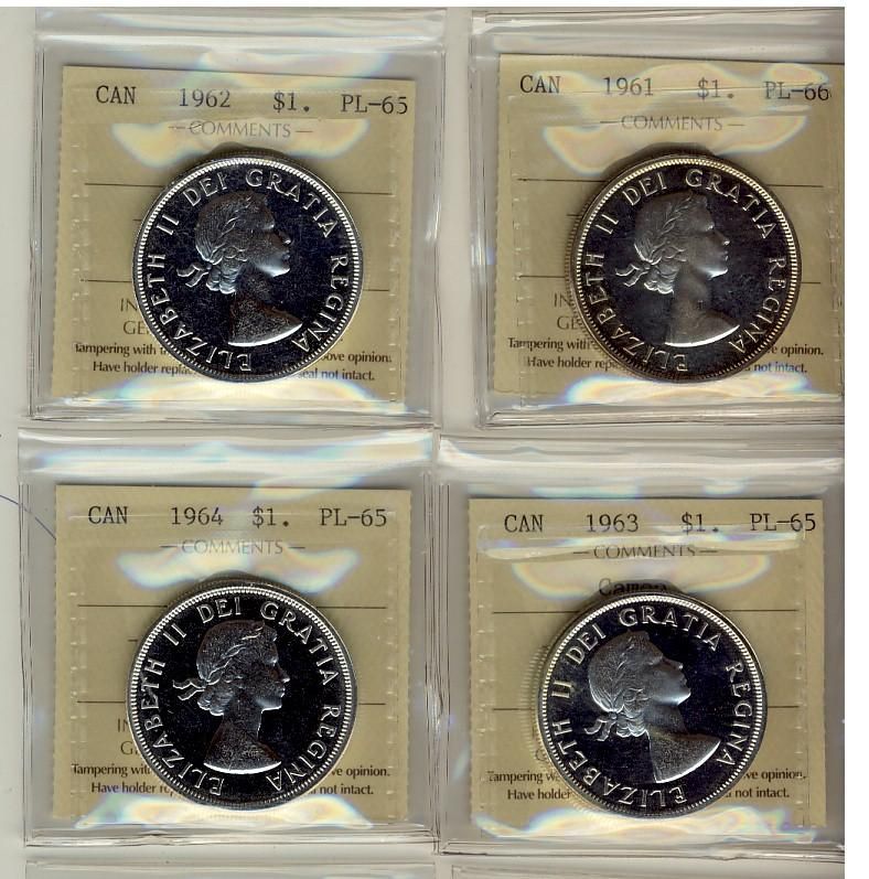 1961 $1 PL66, 1962, 1963 and 1964 $1 ICCS PL65. Lot of 4 coins. 1963 Designated Cameo.