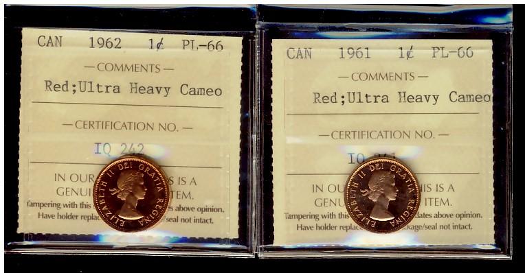 1961 & 1962 1¢ ICCS PL66 Ultra Heavy Cameo. Lot of 2 coins.