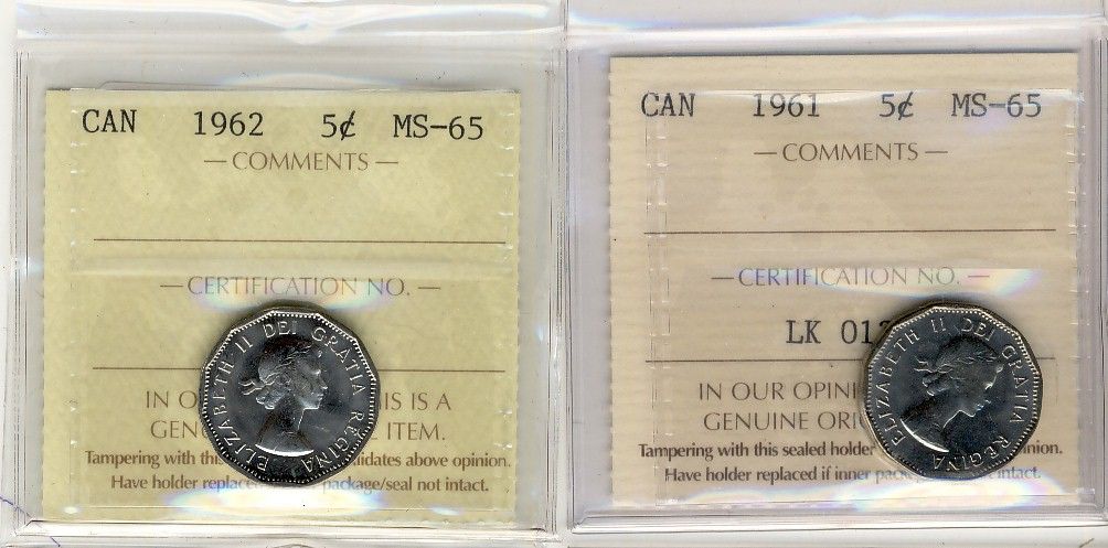 1961, 1962 5 Cents, ICCS MS65; Two coins.