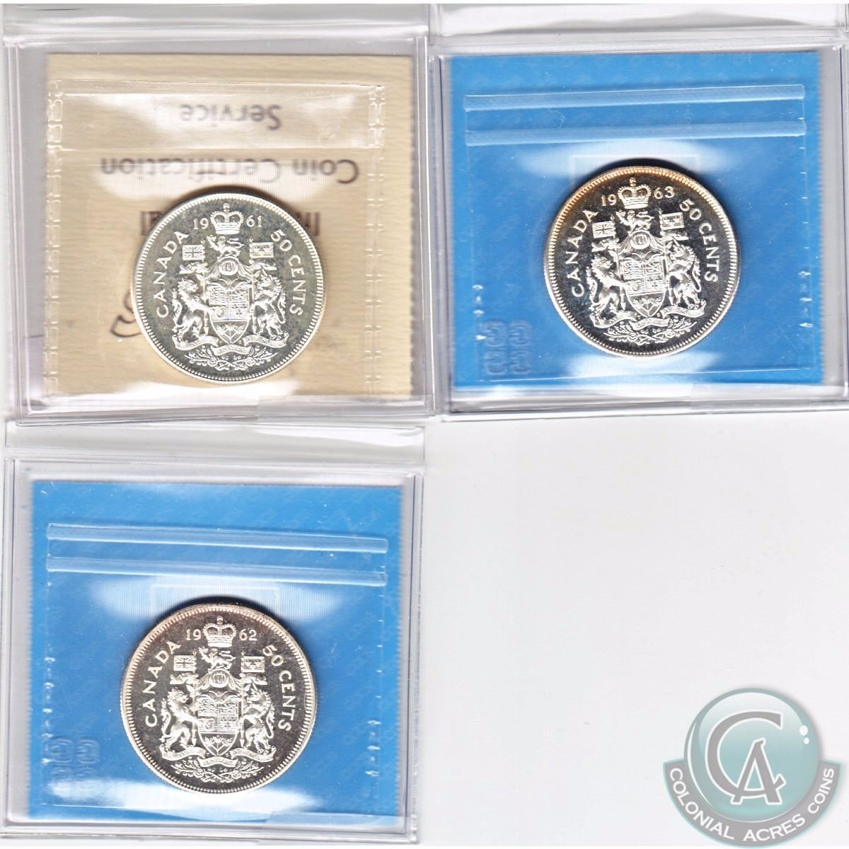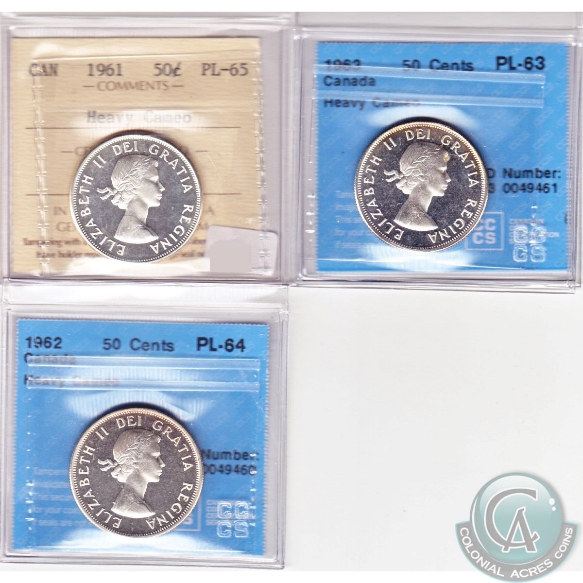 1961,1962, and 1963 Canada 50-cent CCCS/ICCS certified coins. this lot includes: 1961 50 ICCS PL-65; Heavy Cameo, 1962 50c CCCS PL-64; Heavy Cameo, and the 1963 50c CCCS Certified PL-63; Heavy Cameo. 3pcs