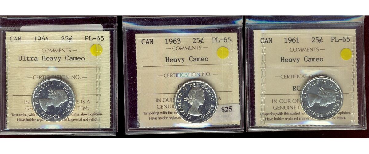 1961, 1963 ICCS PL65 & 1964 25¢ ICCS PL65 Ultra Heavy Cameo. Lot of 3 coins both Heavy Cameo