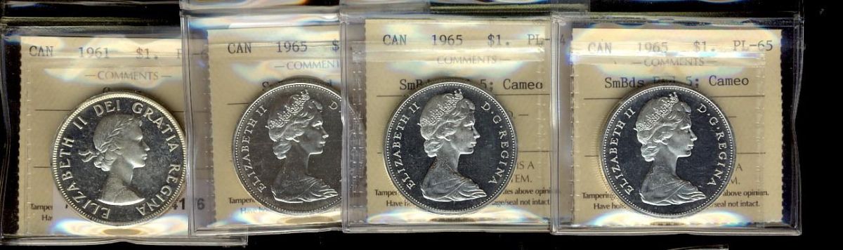 1961 & 1965 $1. Lot of four ICCS Proof like coins. Includes 1961 PL65 Cameo, 1965(2) SmBds Ptd 5 PL65 Cameo and 1965 SmBds Ptd 5.