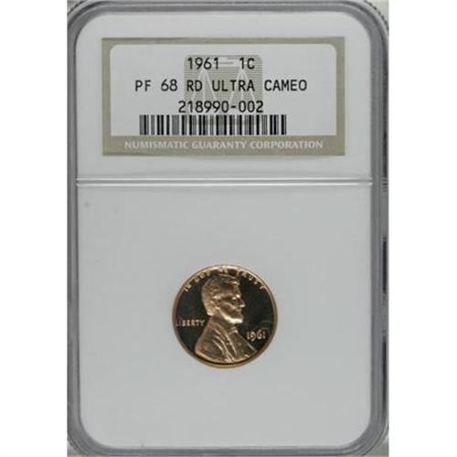 <B>1961 1C PR68 Deep Cameo NGC.</B></I> NGC Census: (26/4). PCGS Population (34/8). Numismedia Wsl. Price for NGC/PCGS coin in PR68: $400. (#93395)<BR><BR><b>Shipping:</b> Coins & Currency (<a target="_blank" href="http://www.heritageauctions.com/common/shipping.php">view shipping information</a>)