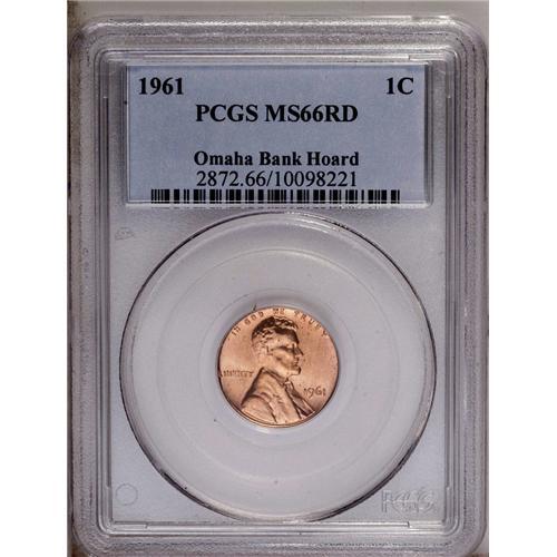 <B>1961 1C MS66 Red PCGS.</B></I> Ex:Omaha Bank Hoard. PCGS Population (223/1). NGC Census: (284/4). Mintage: 756,373,248. Numismedia Wsl. Price for NGC/PCGS coin in MS66: $120. (#2872)<BR><BR><b>Shipping:</b> Coins & Currency (<a target="_blank" href="http://www.heritageauctions.com/common/shipping.php">view shipping information</a>)