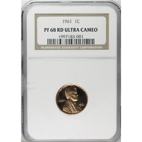 <B>1961 1C PR68 Ultra Cameo NGC.</B></I> The copper-orange surfaces contrast wonderfully with the frosted devices and have plenty of depth. A few small milky spots are noted in the left obverse field.<BR><BR><b>Shipping:</b> Coin/Currency (<a target="_blank" href="http://www.heritageauctions.com/common/shipping.php">view shipping information</a>)