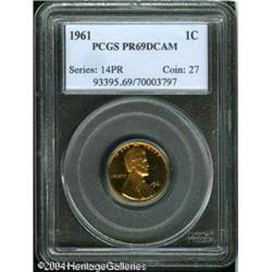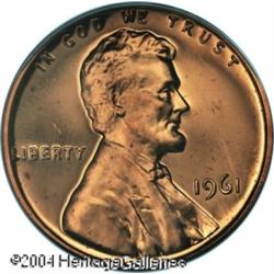 1961 1C PR69 Deep Cameo PCGS. The portrait of Linc <B>1961 1C PR69 Deep Cameo PCGS.</B></I> The portrait of Lincoln on this peerless golden-orange specimen is as frosted for a '61 Cent as we can remember seeing. A virtually perfect example worthy of the finest collection. Population: 8 in 69 Deep Cameo, 0 finer (10/04). <BR><BR><B>Important notice:</B> Heritage usually auctions material at the rate of 200-250 lots per hour. On some occasions eBay Live bid software or the Internet may not be able to keep up with the pace of the auction. We recommend placing a realistic absentee bid now as insurance to avoid disappointment. Occasionally the auctioneer may eliminate or reject an eBay Live bid, and the auctioneer may also reopen a lot after the close of the eBay live bidding (usually because we missed an audience bid), and may reject your bid even if it shows you as the winning bidder. By bidding via eBay Live, you agree that Heritage may award the lot to another bidder at its sole discretion under the circumstances described above or any other reasonable circumstances. Since eBay bids are not shown to us until we open the lot on the floor, we treat those bids just like floor bids. In most cases the floor responds before the eBay bid is presented to us, due to Internet lag time, so for consistency we have made it a policy that floor bids are always considered first over tie eBay live bids. Also please note that all Heritage lots purchased through eBay Live carry a 20% Buyer's Premium. Please make sure you read the Terms and Conditions before you bid. This lot is being auctioned in conjunction with a live floor auction by Heritage Galleries & Auctioneers. All final auction and invoice information will be supplied by Heritage Galleries & Auctioneers, and all other information should be considered preliminary. Lot:5435