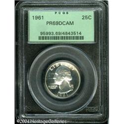 1961 25C PR69 Deep Cameo PCGS. Brilliant surfaces <B>1961 25C PR69 Deep Cameo PCGS.</B></I> Brilliant surfaces are virtually flawless, and display a pronounced cameo appearance. Population: 40 in 69, 0 finer (10/04). <BR><BR><B>Important notice:</B> Heritage usually auctions material at the rate of 200-250 lots per hour. On some occasions eBay Live bid software or the Internet may not be able to keep up with the pace of the auction. We recommend placing a realistic absentee bid now as insurance to avoid disappointment. Occasionally the auctioneer may eliminate or reject an eBay Live bid, and the auctioneer may also reopen a lot after the close of the eBay live bidding (usually because we missed an audience bid), and may reject your bid even if it shows you as the winning bidder. By bidding via eBay Live, you agree that Heritage may award the lot to another bidder at its sole discretion under the circumstances described above or any other reasonable circumstances. Since eBay bids are not shown to us until we open the lot on the floor, we treat those bids just like floor bids. In most cases the floor responds before the eBay bid is presented to us, due to Internet lag time, so for consistency we have made it a policy that floor bids are always considered first over tie eBay live bids. Also please note that all Heritage lots purchased through eBay Live carry a 20% Buyer's Premium. Please make sure you read the Terms and Conditions before you bid. This lot is being auctioned in conjunction with a live floor auction by Heritage Galleries & Auctioneers. All final auction and invoice information will be supplied by Heritage Galleries & Auctioneers, and all other information should be considered preliminary. Lot:6016