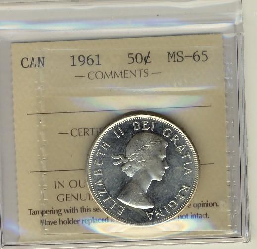 1961 50¢ ICCS MS65. White and lustrous.