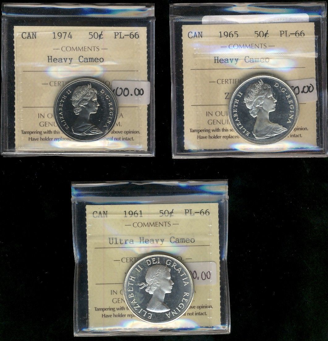 1961 50¢ PL66 Ultra Heavy Cameo, 1965 & 1974 PL66 Heavy Cam. Lot of 3 ICCS coins.