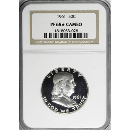 <B>1961 50C PR68</B></I> S<B> Cameo NGC.</B></I> NGC Census: (485/7). PCGS Population (120/5). Numismedia Wsl. Price for NGC/PCGS coin in PR68: $180. (#86702)<BR><BR><b>Shipping:</b> Coins & Currency (<a target="_blank" href="http://www.heritageauctions.com/common/shipping.php">view shipping information</a>\)