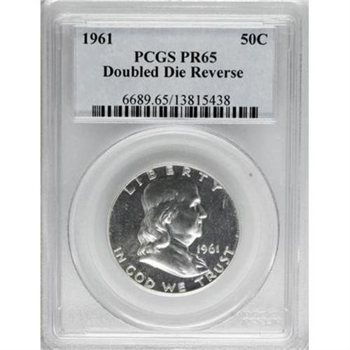 <B>1961 50C Doubled Die Reverse PR65 PCGS.</B></I> FS-801, formerly FS-013. E PLURIBUS UNUM and UNITED are dramatically die doubled. The remainder of the legends also show significant doubling. A deeply mirrored and brilliant Gem of this scarce variety, photographed on page 198 of the 2008 <I>Guide Book.</B></I> Population: 8 in 65, 27 finer (7/07).<BR><BR><B>Coin Engraver:</B> John R. Sinnock<BR><BR><b>Shipping:</b> Coins & Currency (<a target="_blank" href="http://www.heritageauctions.com/common/shipping.php">view shipping information</a>)