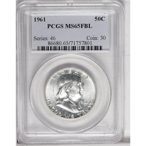 <B>1961<50C> MS65 Full Bell Lines PCGS.</B></I> A mere trace of gold toning visits this thoroughly lustrous and well preserved Gem. Strike incompletion is limited to Franklin's cheek. PCGS has certified only five pieces finer as Full Bell Lines (8/06).