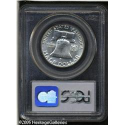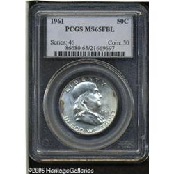<B>1961 50C MS65 Full Bell Lines PCGS.</B></I> Fully brilliant and sharply struck with excellent surfaces. The obverse has two small splashes of dark iridescent toning at the borders, at 2:30 and at 9 o'clock. This is a elusive issue in Gem quality with full bell lines. Population: 116 in 65, 3 finer (1/05).<BR><I>From The Mike Jacobson Collection.</B></I> Lot:8268