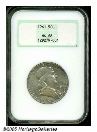 <B>1961<50C> MS66 NGC.</B></I> A moderately toned and flashy Gem with pleasing fields and a good strike. Untold Uncirculated rolls of this issue were melted circa 1980.