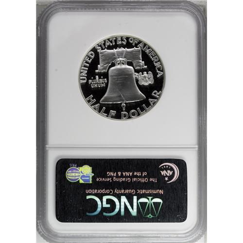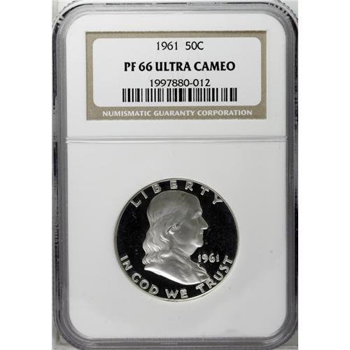 <B>1961<50C> PR66 Ultra Cameo NGC.</B></I> Deeply reflective with highly contrasting, heavily frosted devices. Untoned save for a tiny spot of cherry-red near the top of Franklin's head.