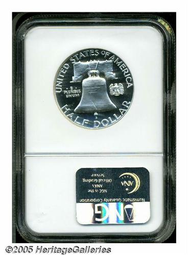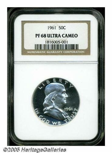 <B>1961<50C> PR68 Deep Cameo NGC.</B></I> The frosted devices on the reverse are particularly thick in comparison to the obverse devices, yet both the obverse and reverse show the contrast that is necessary for the designation. Population: 46 in 68 Ultra Cameo, 2 finer (6/05).