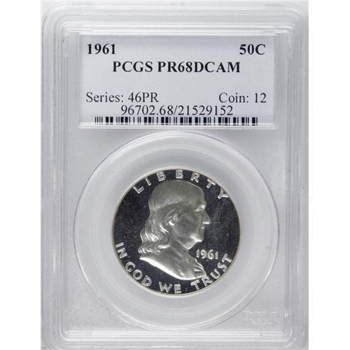 <B>1961 50C PR68 Deep Cameo PCGS.</B></I> Deeply reflective with wonderful contrast that only intensifies on the reverse (doubling not included.) Tied for the finest certified Deep Cameo example at PCGS (10/06).<BR><BR><b>Shipping:</b> Coin/Currency (<a target="_blank" href="http://www.heritageauctions.com/common/shipping.php">view shipping information</a>)
