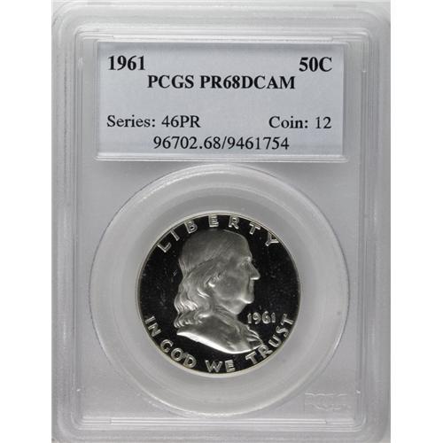 <B>1961 50C PR68 Deep Cameo PCGS.</B></I> Deeply reflective with great contrast. Isolated haze appears in the obverse fields, and a small spot of milky patina is present to the left of the bell. This otherwise untoned piece is tied for the finest certified Deep Cameo example at PCGS (11/06).<BR><BR><b>Shipping:</b> Coin/Currency (<a target="_blank" href="http://www.heritageauctions.com/common/shipping.php">view shipping information</a>)