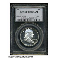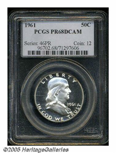 <B>1961<50C> PR68 Deep Cameo PCGS.</B></I> Superlative example with deeply mirrored fields with a hint of ice provide a rich backdrop for the nicely frosted devices. A tiny lintmark is seen beneath Franklin's chin. As of (6/05) none have been graded higher by PCGS.