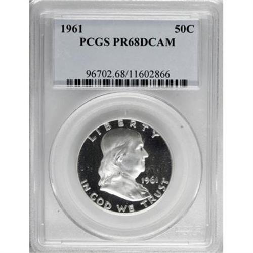 <B>1961 50C PR68 Deep Cameo PCGS.</B></I> Visually unimprovable, the 1961 makes a perfect type coin. It is a well-produced later date in the Franklin series, and high grade cameo coins are among the more available dates in the series. Still, few are known in this grade. Brilliant throughout, each side shows stark white-on-black cameo contrast with illimitable depth of mirrored reflectivity in the fields. Population: 73 in 68, 0 finer (6/07).<BR><BR><b>Shipping:</b> Coins & Currency (<a target="_blank" href="http://www.heritageauctions.com/common/shipping.php">view shipping information</a>)