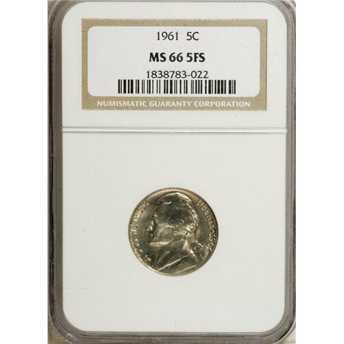 <B>1961 5C MS66 Full Steps NGC.</B></I> This fully lustrous Jefferson nickel displays a very thin layer of even tan color. The design features are well impressed throughout, and the NGC holder indicates "5 Full Steps." A few minute marks on Jefferson's cheek, as well as on portions of Monticello, are mentioned for accuracy.<BR><BR><b>Shipping:</b> Coins & Currency (<a target="_blank" href="http://www.heritageauctions.com/common/shipping.php">view shipping information</a>)