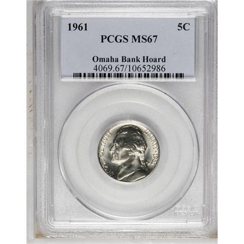 <B>1961 5C MS67 PCGS.</B></I> Ex: Omaha Bank Hoard. This lustrous Superb Gem has light blue and gold toning on each side. A few minuscule marks are noted on Jefferson's shoulder. Population: 2 in 67, 0 finer (10/06).<BR><BR><b>Shipping:</b> Coin/Currency (<a target="_blank" href="http://www.heritageauctions.com/common/shipping.php">view shipping information</a>)