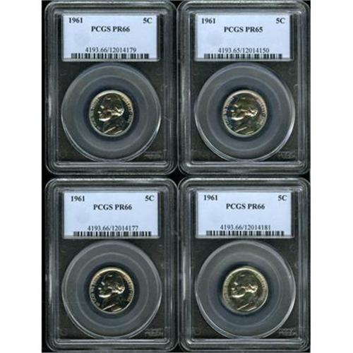 <B>1961 5C PR65 PCGS, (3)1961 PR66 PCGS.</B></I><BR><BR><B>Coin Engraver:</B> Felix Schlag<BR><BR><b>Shipping:</b> Coins & Currency (<a target="_blank" href="http://www.heritageauctions.com/common/shipping.php">view shipping information</a>)