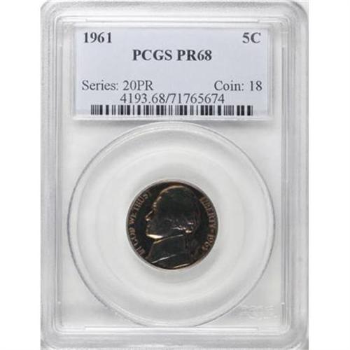 <B>1961 5C PR68 PCGS.</B></I> Bold tangerine patina visits the margins of this Superb Gem, while the centers exhibit bold heather and magenta toning. Exquisite surface quality for the issue. PCGS has graded only three finer pieces (1/08).<BR><BR><B>Coin Engraver:</B> Felix Schlag<BR><BR><b>Shipping:</b> Coins & Currency (<a target="_blank" href="http://www.heritageauctions.com/common/shipping.php">view shipping information</a>)