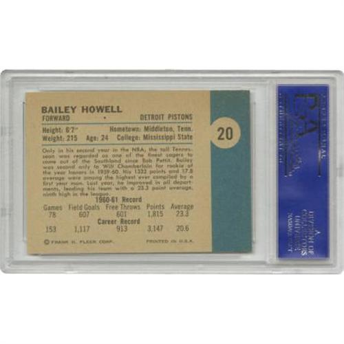 <B>1961-62 Fleer Bailey Howell #20 PSA Mint 9.</B></I> From the colorful 1961-62 Fleer basketball set we offer this high-grade rookie card featuring HOFer Bailey Howell. Howell was a standout at Mississippi State, as well as starring for the Pistons, Celtics, Sixers and Bullets at the professional level. Sharp corners and outstanding color and gloss separate this card from the majority of 1961-61 Fleer examples, displaying wonderfully with its largely uninterrupted fields of red and orange.<BR><BR><b>Shipping:</b> Sportscard (<a target="_blank" href="http://www.heritageauctions.com/common/shipping.php">view shipping information</a>)
