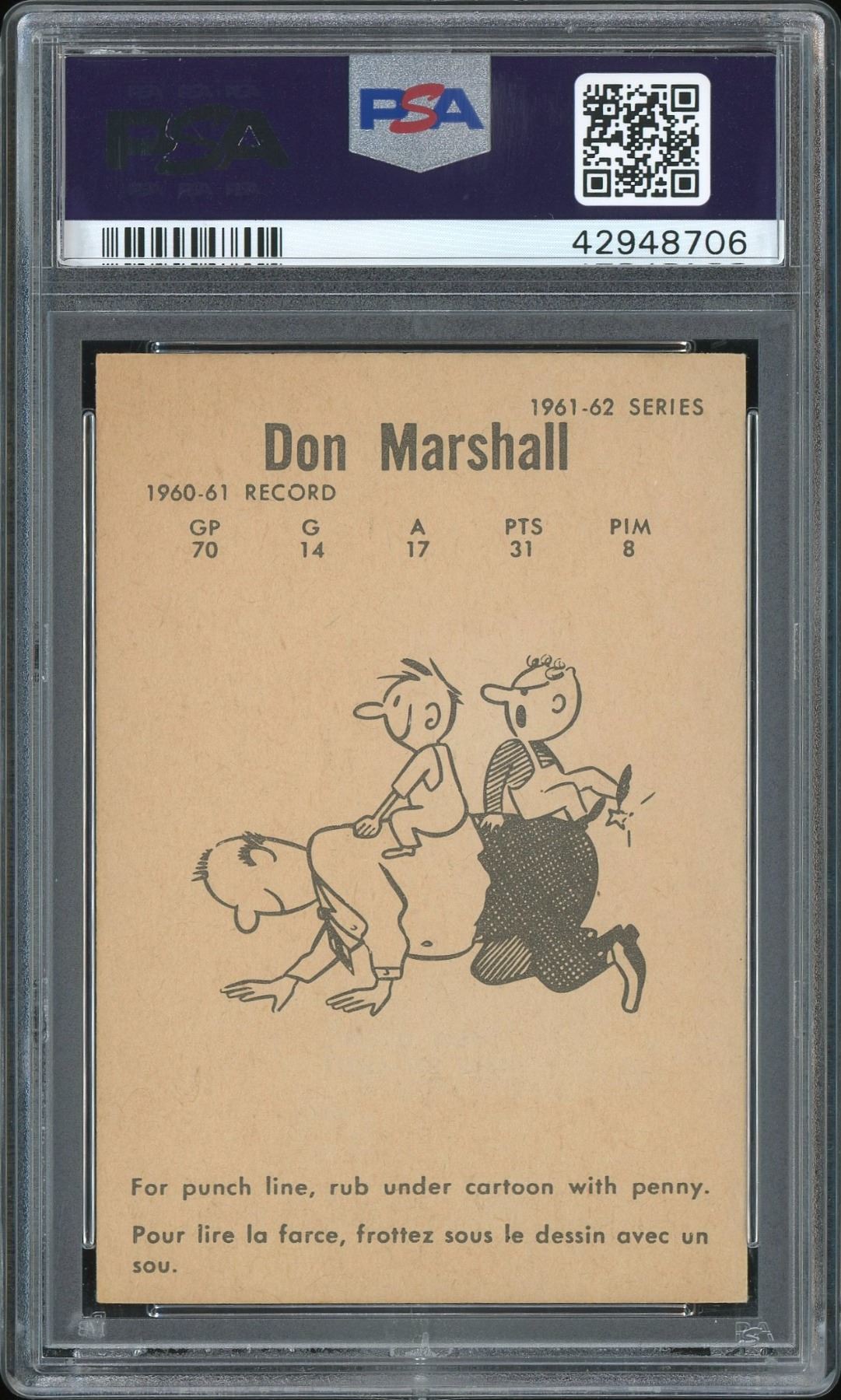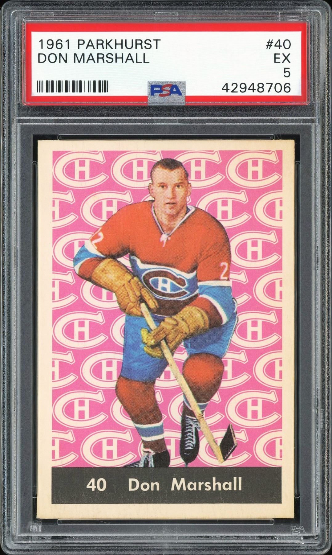 Marshall was a premier checking forward with Montreal's late 50s dynasty team, winning 5 straight Stanley Cups. He lasted 19 seasons, including 10 in Montreal and 7 in New York. Graded 5 EX by PSA.