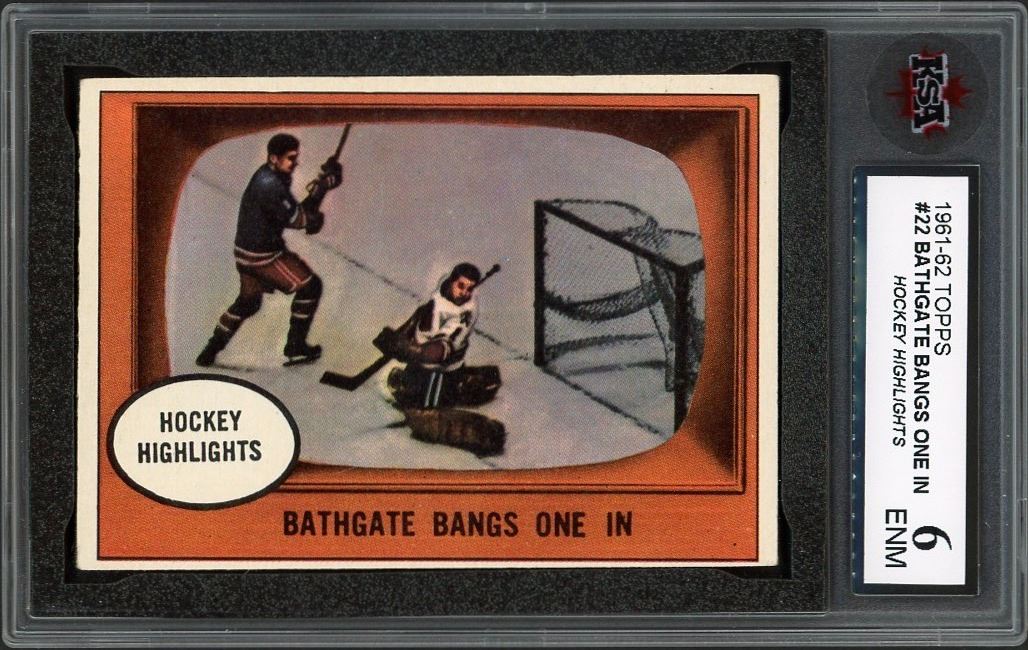 Nice action card featuring HOFers, Andy Bathgate and Glenn Hall! Graded 6 EX-NM by KSA.