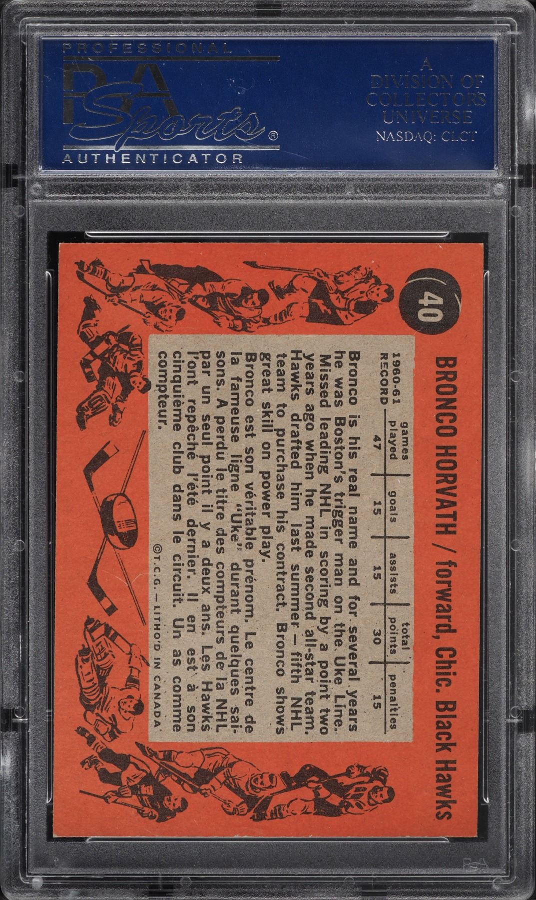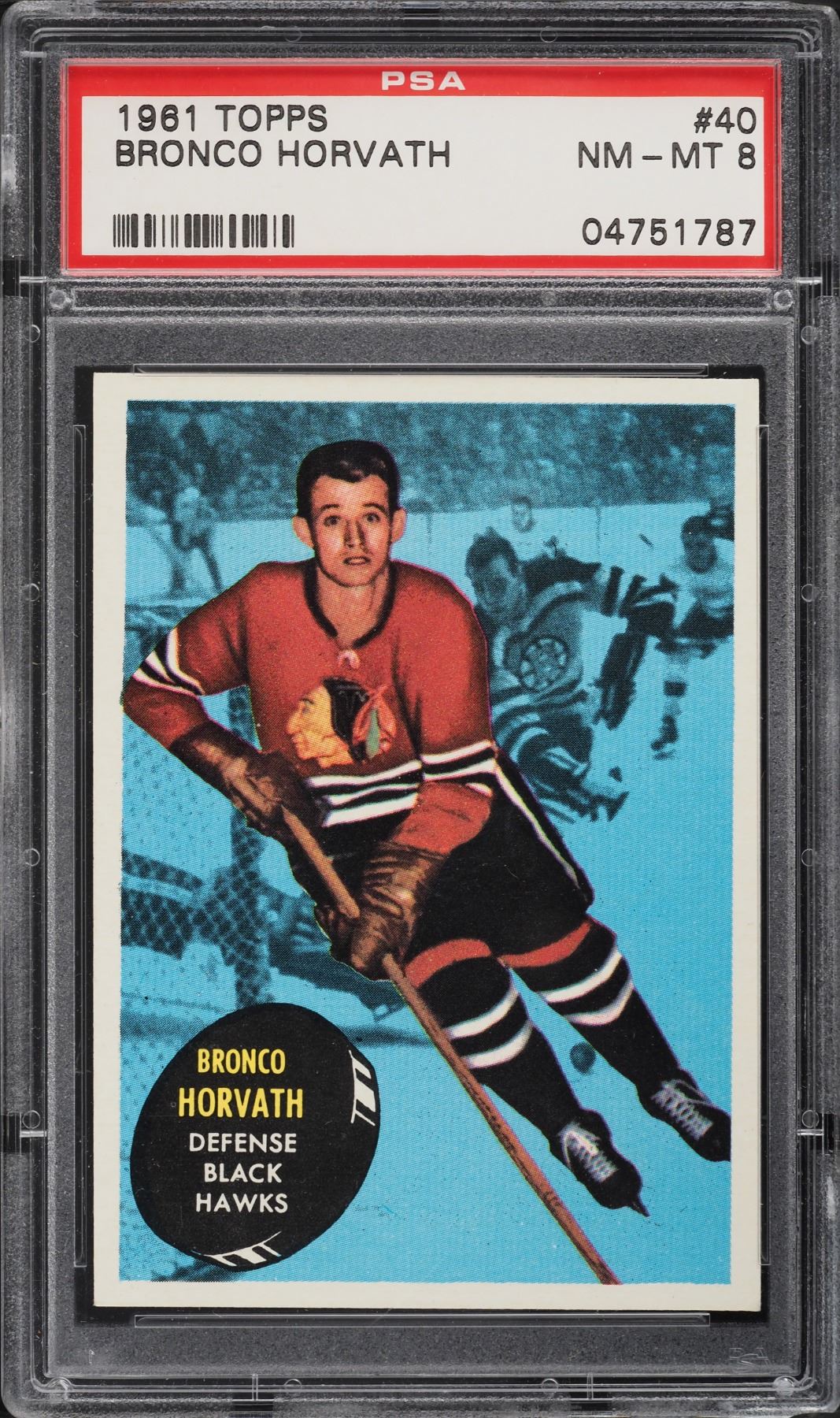 More upper tier quality here, featuring Hawks winger Bronco Horvath, who had a long productive career as both a player and coach. This one is graded 8 NM-MT by PSA, can never go wrong with lucky 8s!