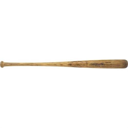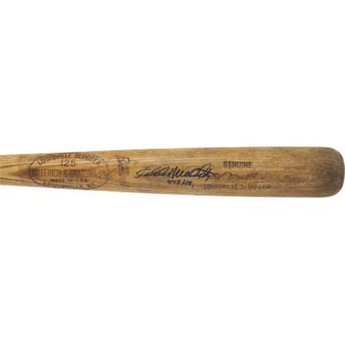 <B>1961-63 Eddie Mathews Game Used Bat.</B></I> One of the most beloved Braves in team history, Mathews represented the club in three different cities, providing the team with 493 of his career's 512 home runs. The tremendous use evident in the abused grain of this signature model Hillerich & Bradsby S2 suggests that several of those long balls were delivered from its surface before a crack in the handle ended its long tenure in Eddie's Hall of Fame hands. Many ball and stitch impressions are visible upon the right, left and back barrel, and the ghost of spiral grip tape, since removed, can been seen on the handle. A small degree of chipping at the end of the barrel causes no concern. Number "41" appears in vintage marker on knob. Length and weight are thirty-five inches and thirty-two ounces respectively. A 9+/10 blue sharpie signature on the barrel is bolstered by a "512 HRs" notation in Mathews' hand. A solid example of a tough Hall of Fame bat, graded GU6.5. <I>LOA from Taube & Malta (bat). LOA from PSA/DNA (autograph). LOA from James Spence Authentication (autograph).</B></I><BR><BR><b>Shipping:</b> Bats, Clubs, Sticks, Swords, Rif (<a target="_blank" href="http://www.heritageauctions.com/common/shipping.php">view shipping information</a>)