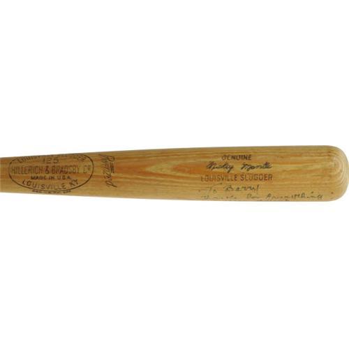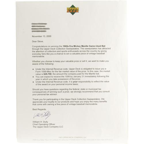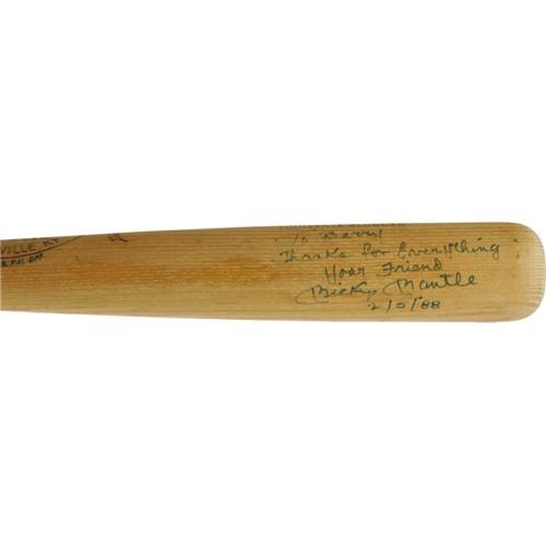<B>1961-63 Mickey Mantle Game Bat Signed to Barry Halper.</B></I> This marvelous keepsake was awarded to a lucky baseball card collector in 2000 after his name was drawn from a pool of thousands in the Upper Deck Collection Sweepstakes. The team-ordered lumber dates to one of the most exciting eras of the Mick's storied career, a history marked by the famous Bronx home run chase, three pennants and two World Championships. Though this signature model Hillerich & Bradsby K55 never got in on the action, it has still made something very special of its life, as a home for a blue sharpie inscription to collector extraordinaire Barry Halper. The 9/10 text reads, "To Barry, Thanks for Everything, Your Friend, Mickey Mantle, 2/5/88." Length and weight are thirty-five inches and thirty-two ounces respectively. We all know how tough and valuable Mantle signed bats are, with the vast majority of specimens merely modern replica models. Such a lengthy and desirable inscription from one celebrity to another, found upon a genuine vintage game model bat, sets this remarkable piece apart from (and above) the rest. Included is Upper Deck promotional material, including consignors notification letter, and a copy of the March 2001 "Beckett Baseball Card Monthly" that make mention in text and photographs of our consignor's sweepstakes win. <I>LOA from Taube & Malta. LOA from PSA/DNA. LOA from James Spence Authentication.</B></I><BR><BR><b>Shipping:</b> Bats, Clubs, Sticks, Swords, Rif (<a target="_blank" href="http://www.heritageauctions.com/common/shipping.php">view shipping information</a>)