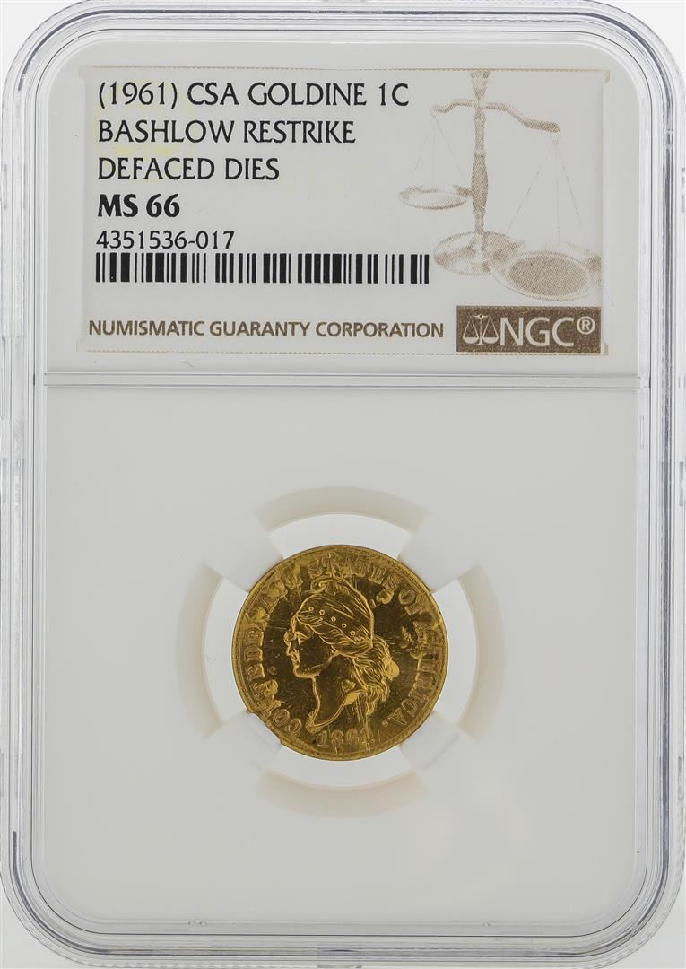 One 1961 CSA 1 Cent Goldine Coin Bashlow Restrike NGC MS66. NGC Certified.