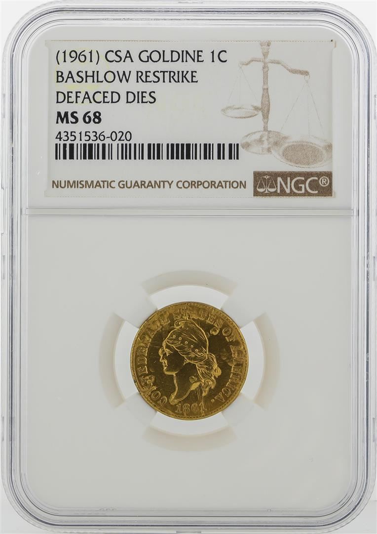 One 1961 CSA 1 Cent Goldine Coin Bashlow Restrike NGC MS68. NGC Certified.